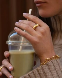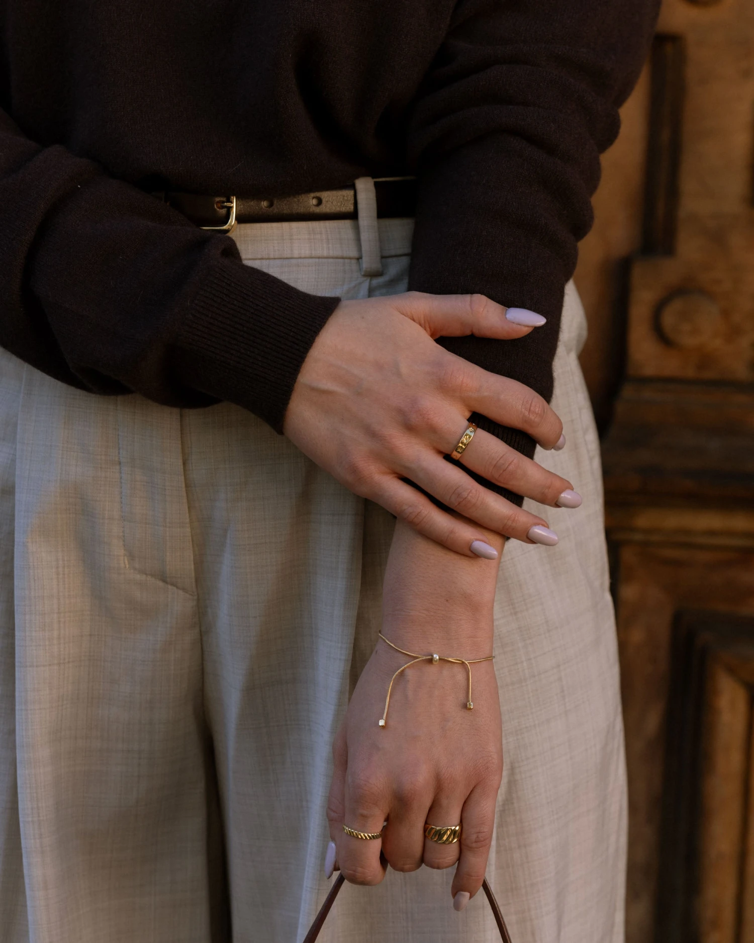 Bague fine avec 5 étoiles gravées en plaqué or. Accumulable avec d’autres bagues de nos collections.