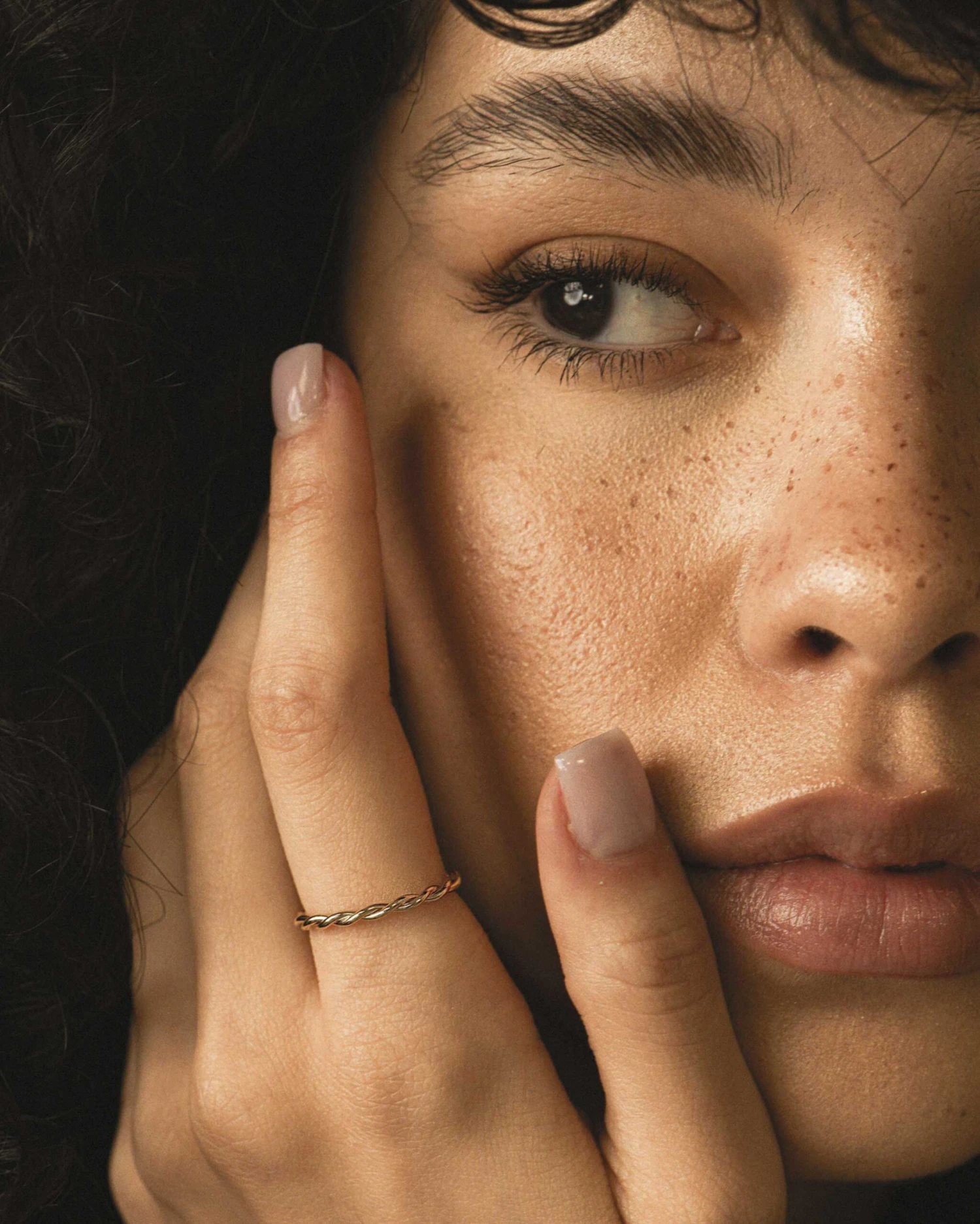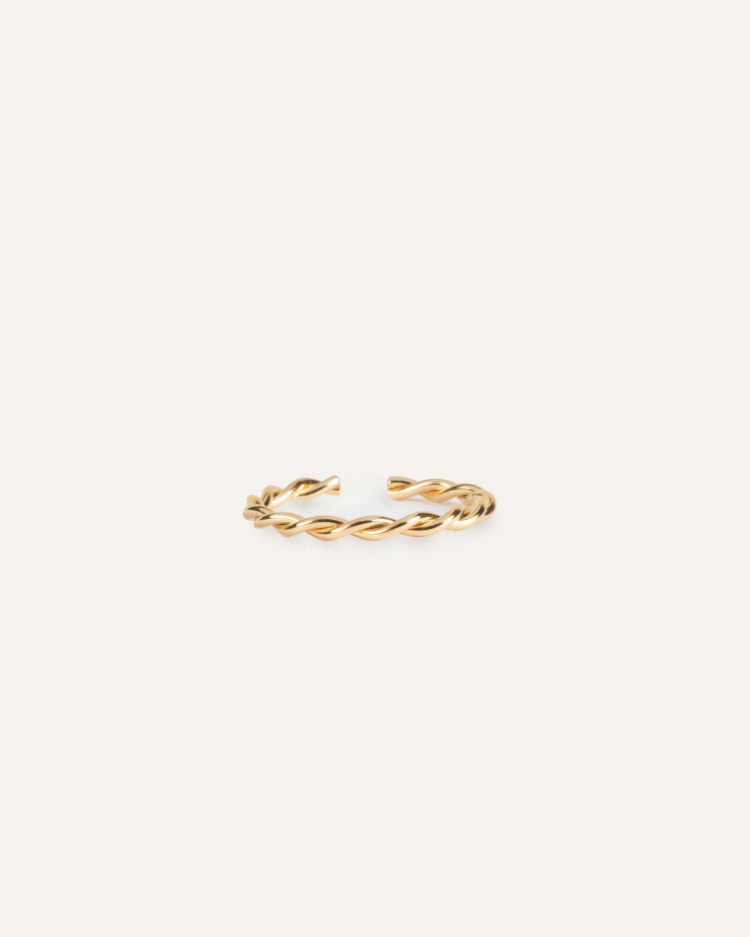 Bague ajustable torsadée en plaqué or. Accumulable avec d’autres bagues de nos collections.