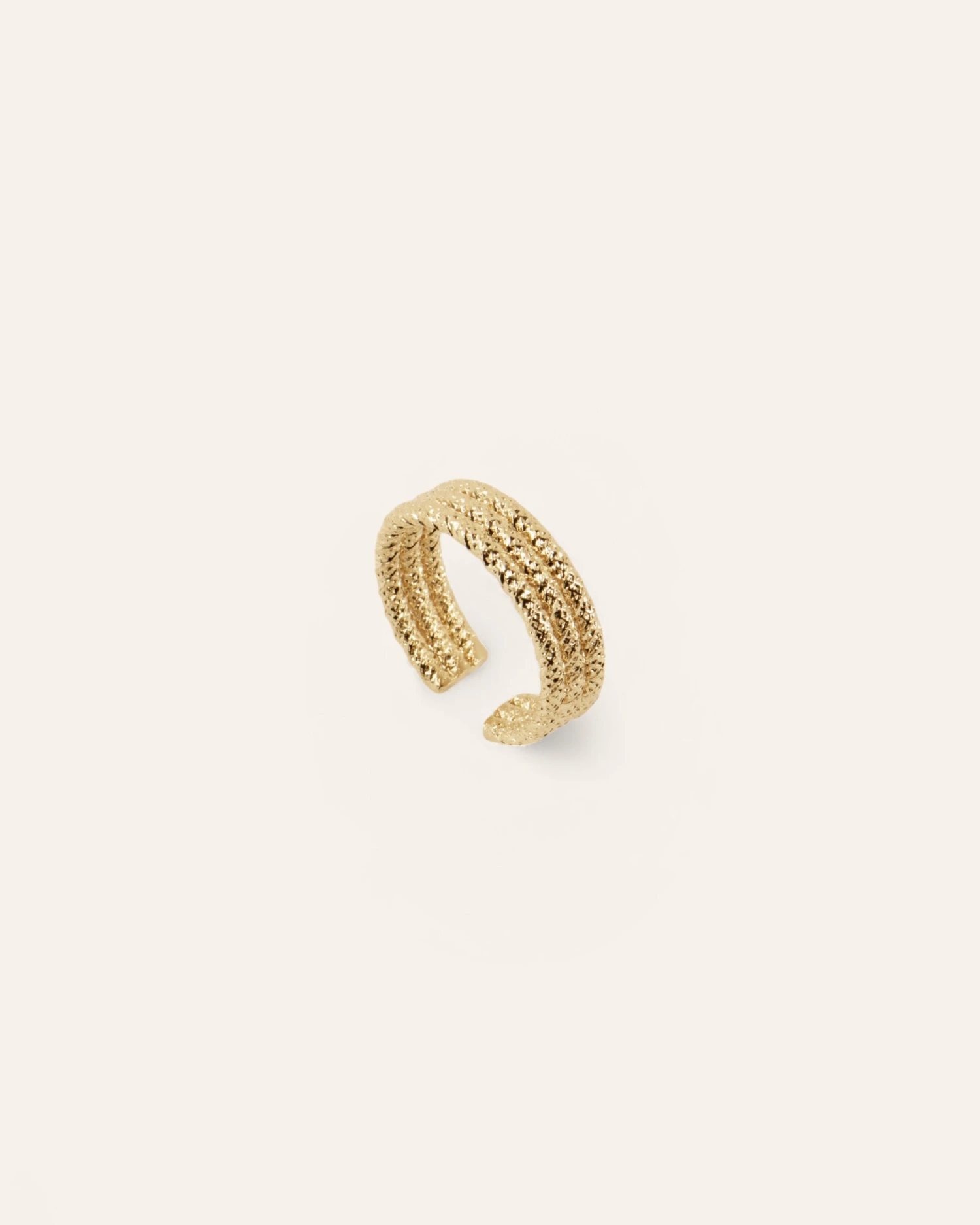 Bague large texturĂ©e en plaquĂ© or. Accumulable avec d’autres bagues de nos collections