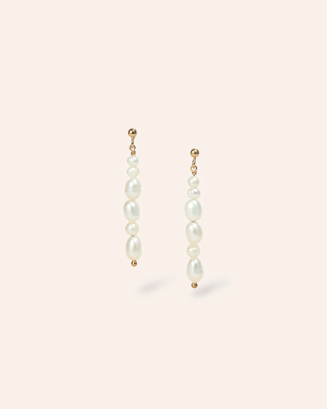 Boucles d’oreilles pendantes dorĂ©es Ă l’or fin ornĂ©es de Perles de Culture de formes et tailles diffĂ©rentes.