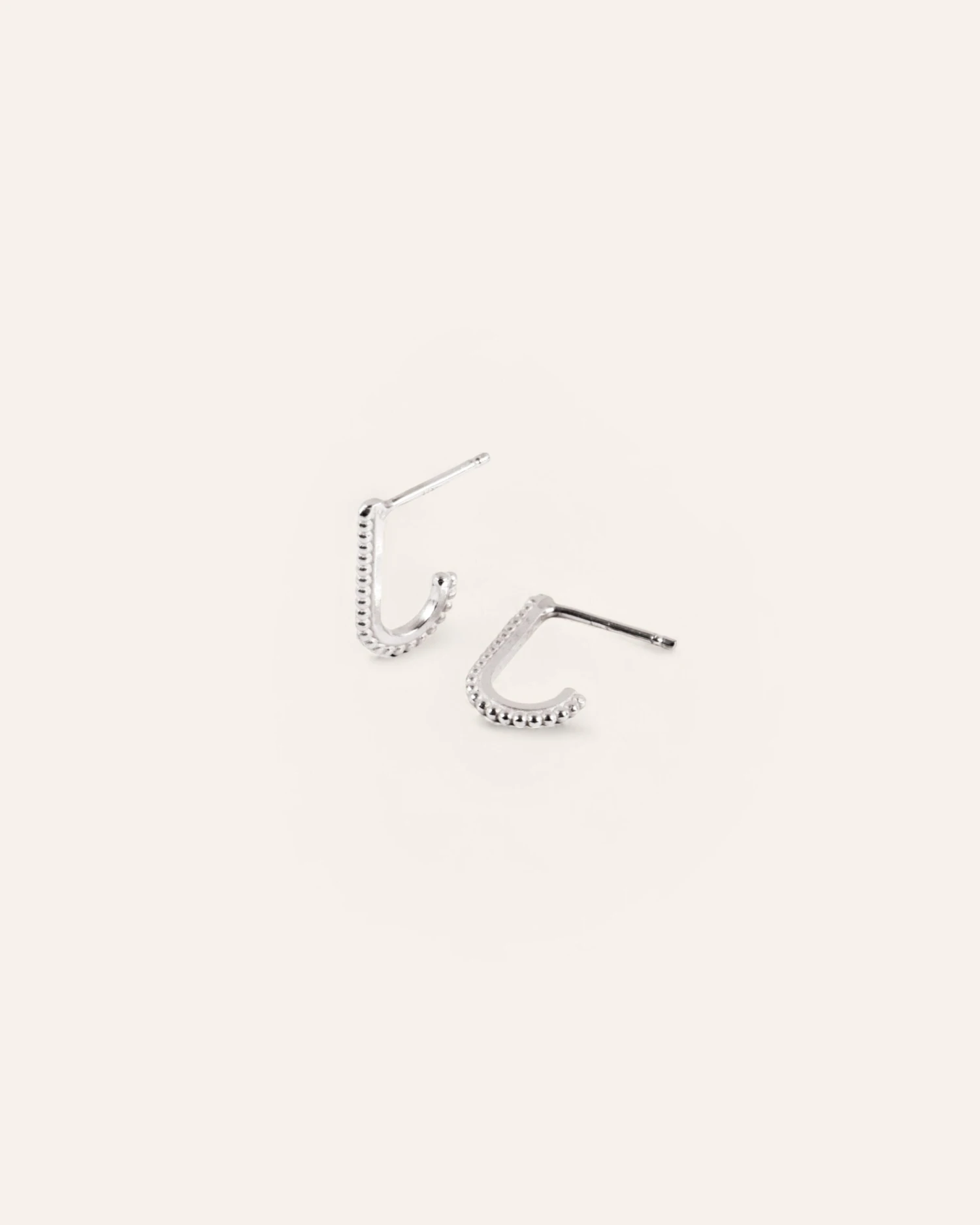 Boucles d’oreilles délicatement perlée en argent massif de forme arrondie. Accumulables avec d’autres boucles de nos collections.
