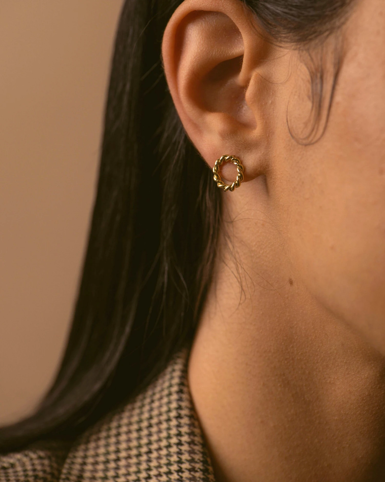 Boucles d’oreilles rondes composées d’un petit anneau torsadé dorées à l’or fin.