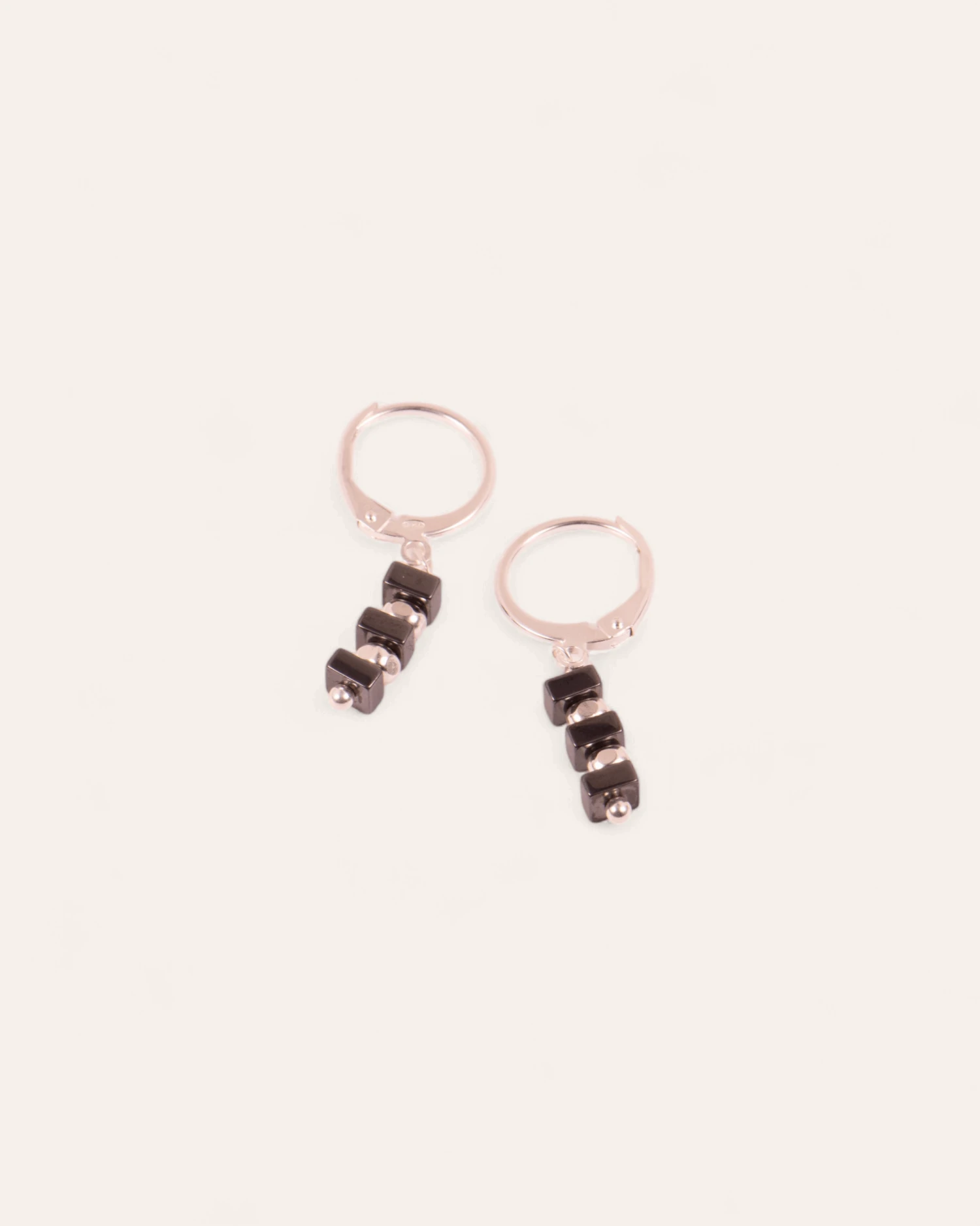 Dormeuses arrondies en argent massif 3 pierres carrées d’Hématite et deux perles en argent