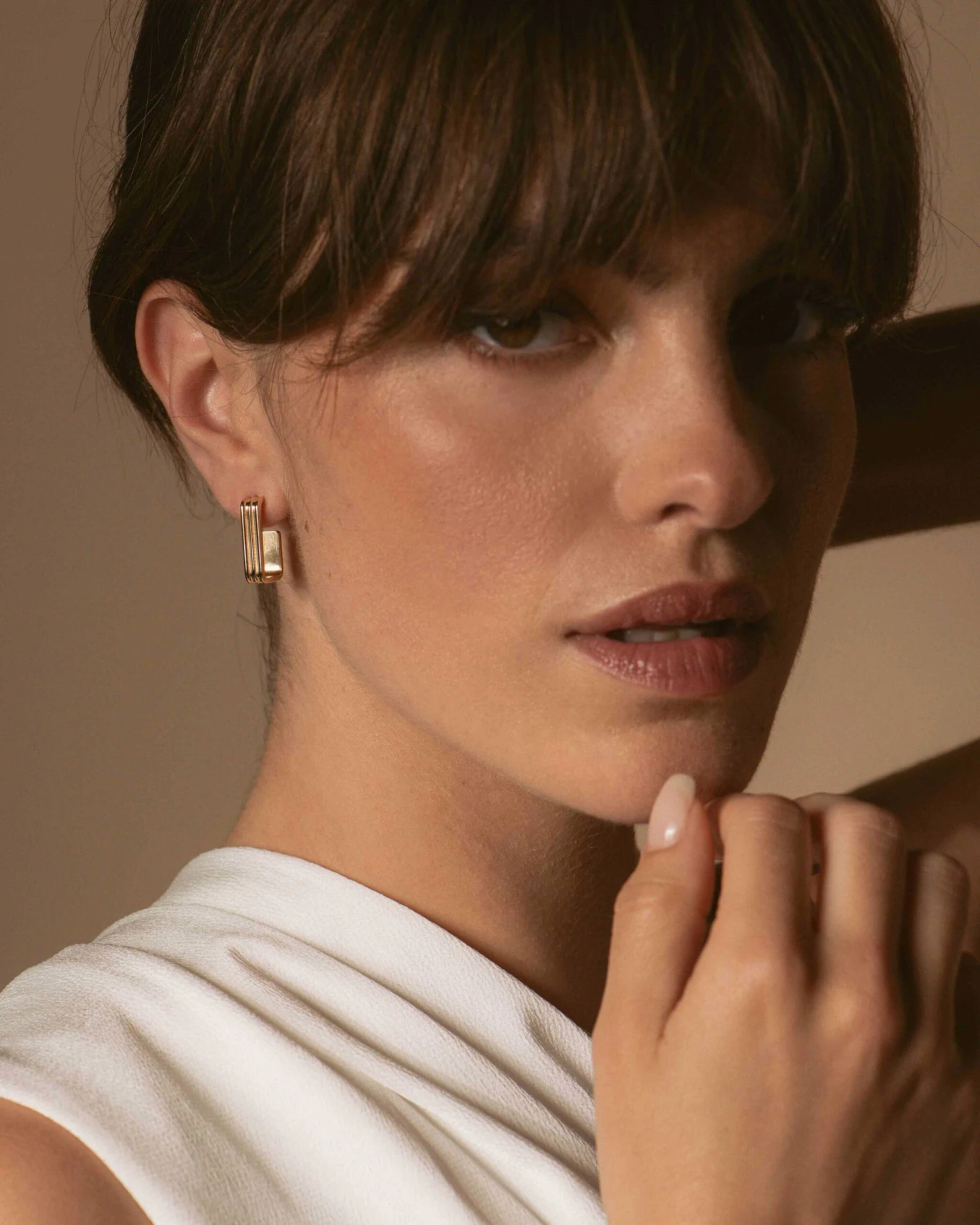 Boucles d’oreilles rectangle en plaqué or, motif rayure. Accumulable avec d’autres boucles d’oreilles de nos collections.