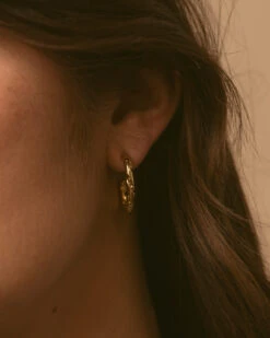 Boucles d’oreilles soleillĂ©es avec une perle de culture ronde et plate dorĂ©es Ă l’or fin.