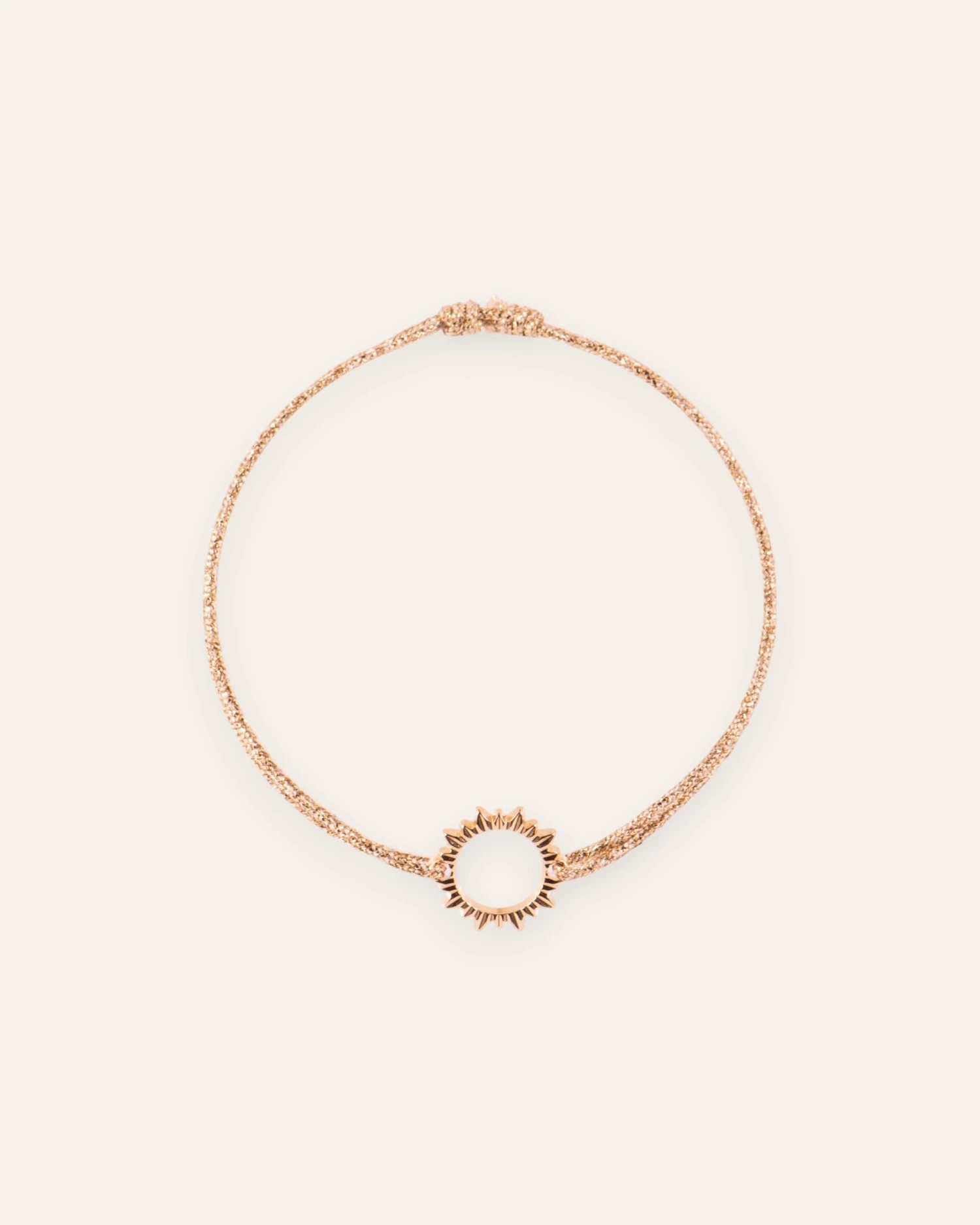 Bracelet cordon doré ajustable avec un petit soleil ajouré doré à l’or fin.