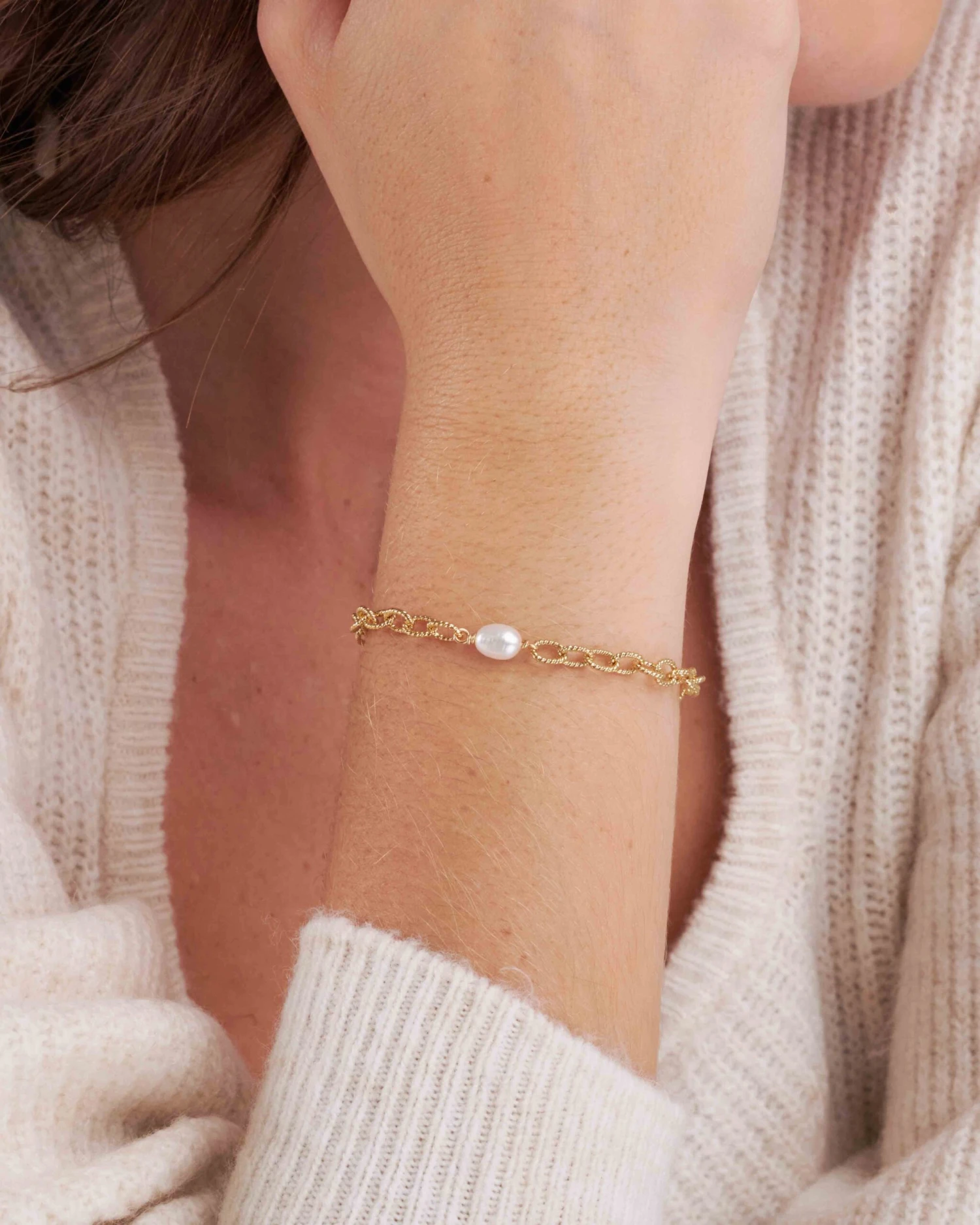 Bracelet chaîne ovale facetté doré accompagné d’une perle de culture. Accumulable avec d’autres bracelets de nos collections.