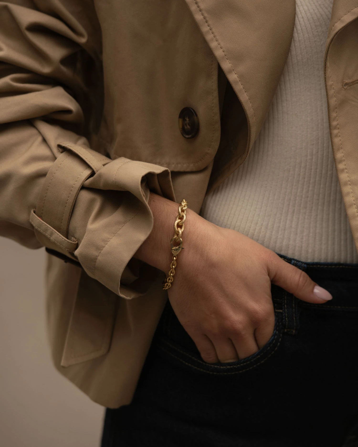 Bracelet doré à l’or fin en mailles rondes texturées de trois tailles différentes.
