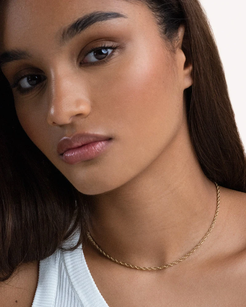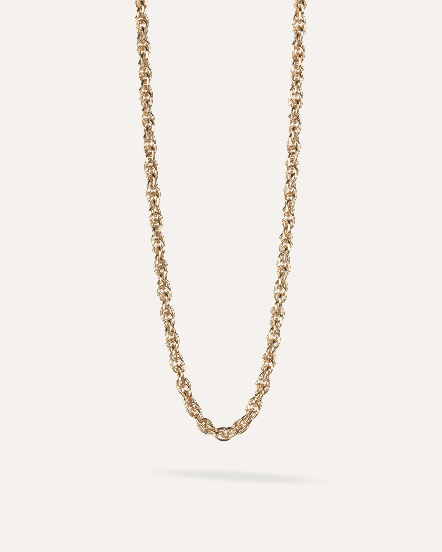 Collier maille corde en plaqué or. Accumulable avec d’autres colliers de nos collections.