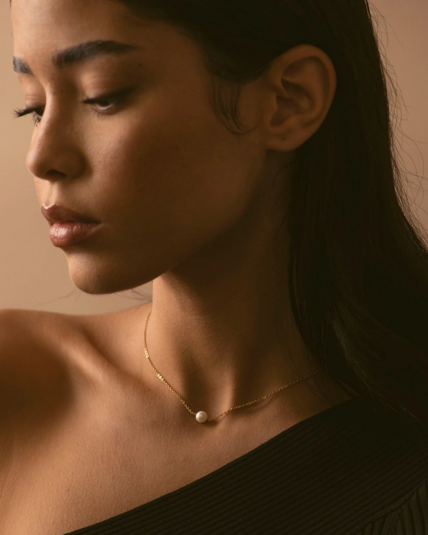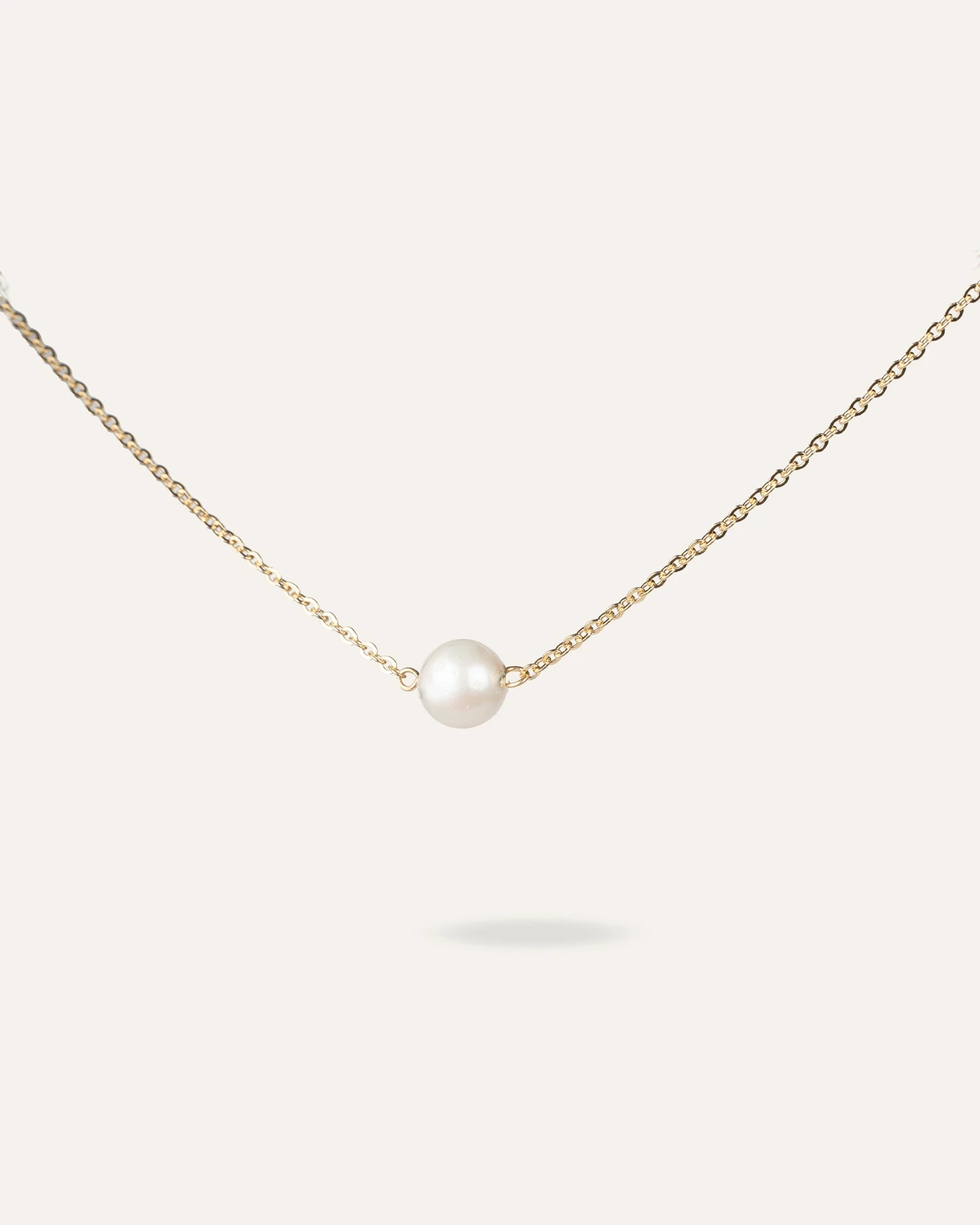 Collier fin en plaqué or avec une perle ronde d’environ 5mm.