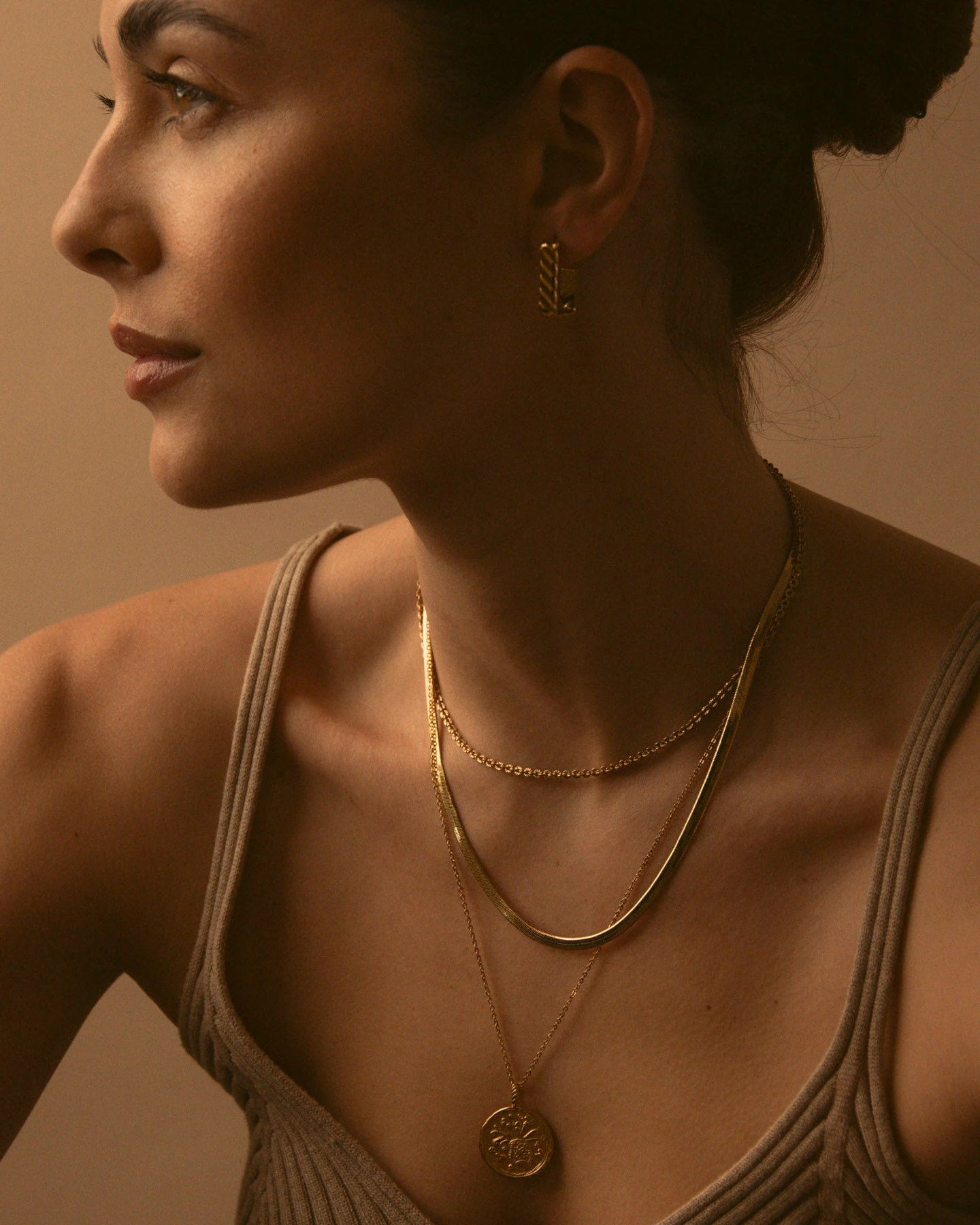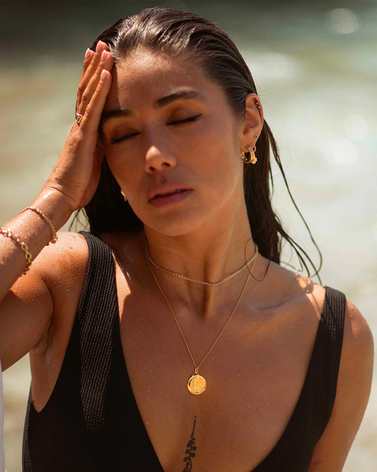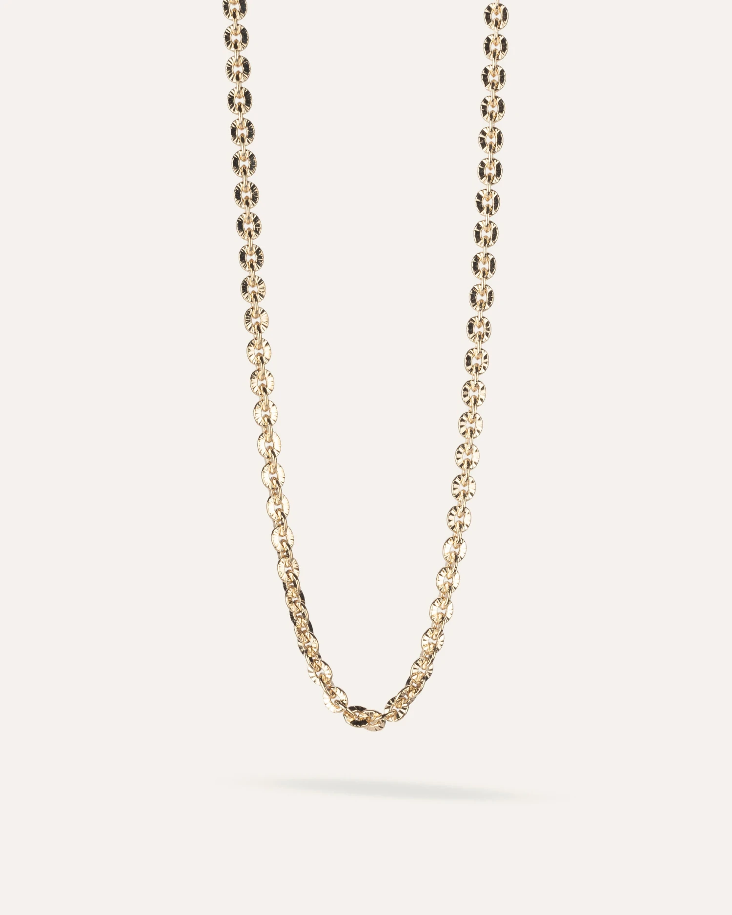 Collier maille soleil en plaqué or. Accumulable avec d’autres colliers de nos collections.