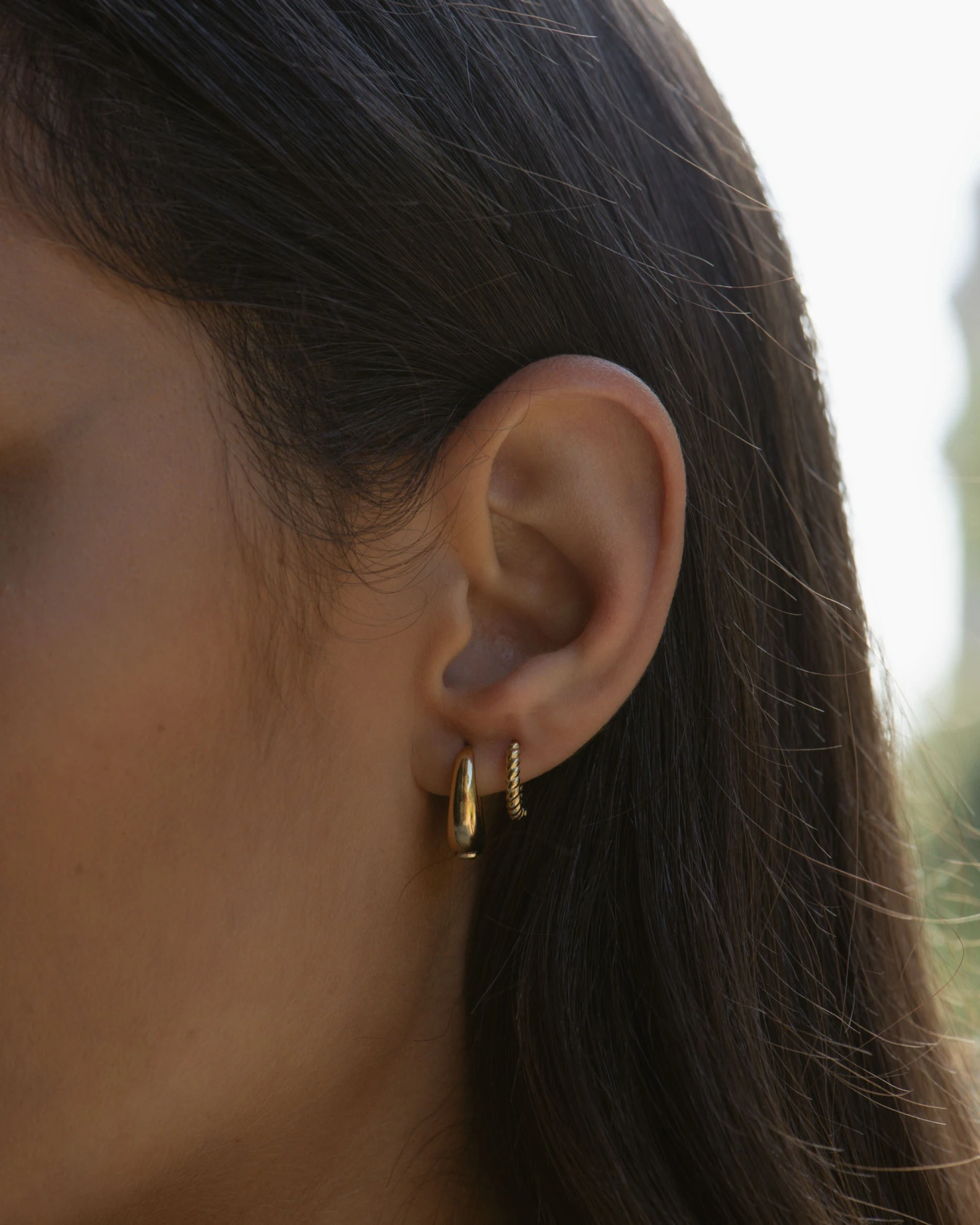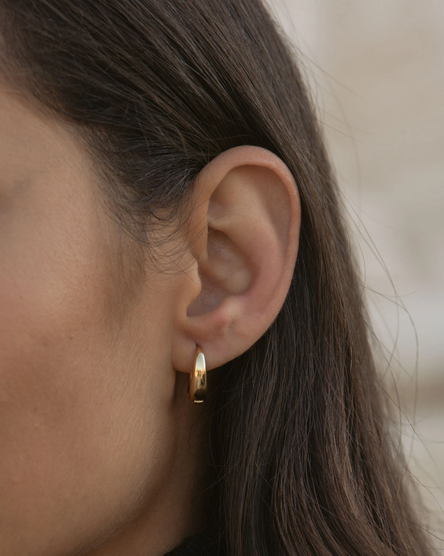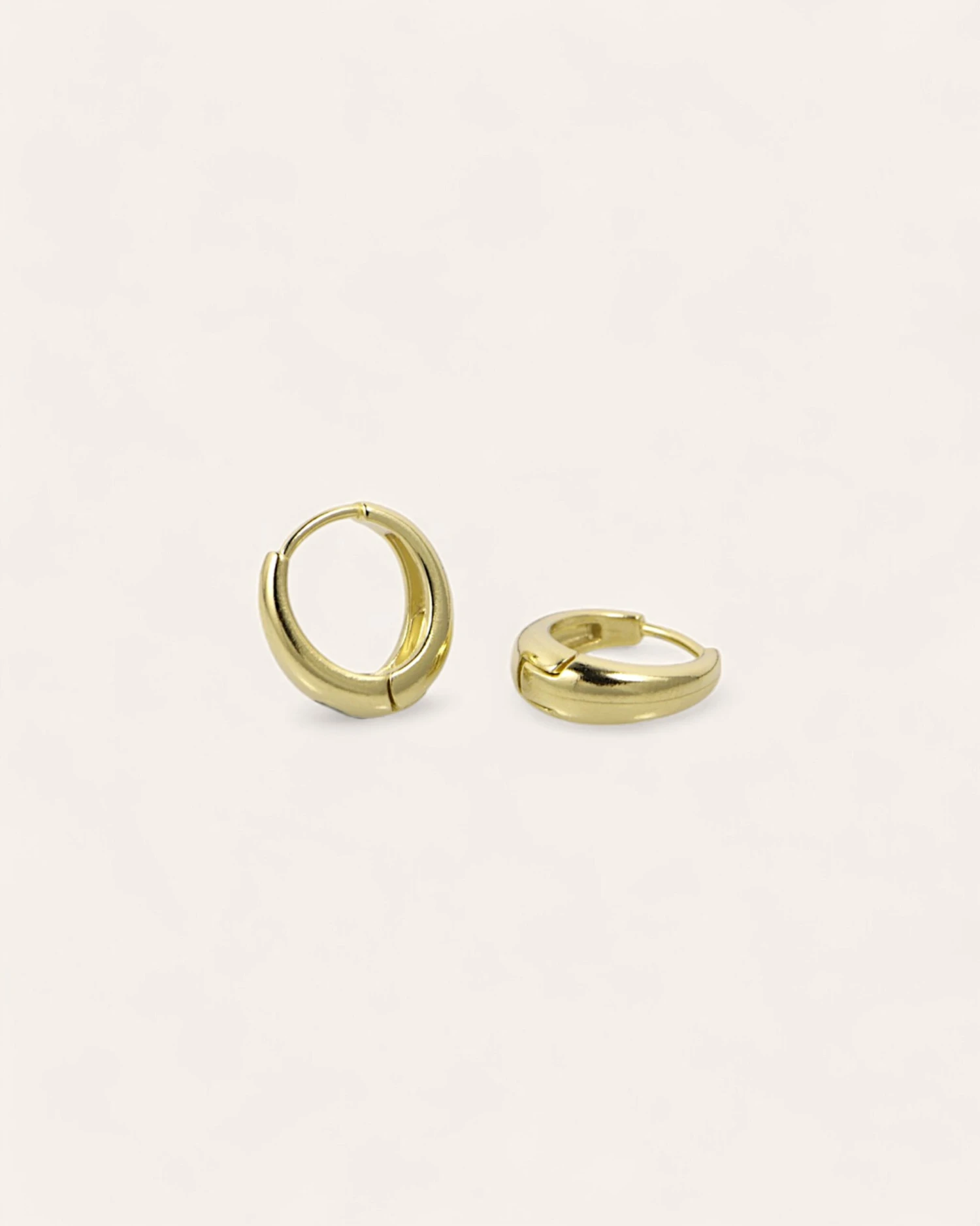 Petites créoles en forme de dormeuses dorées à l’or fin. À porter seules ou en accumulation avec d’autres pièces de nos collections.