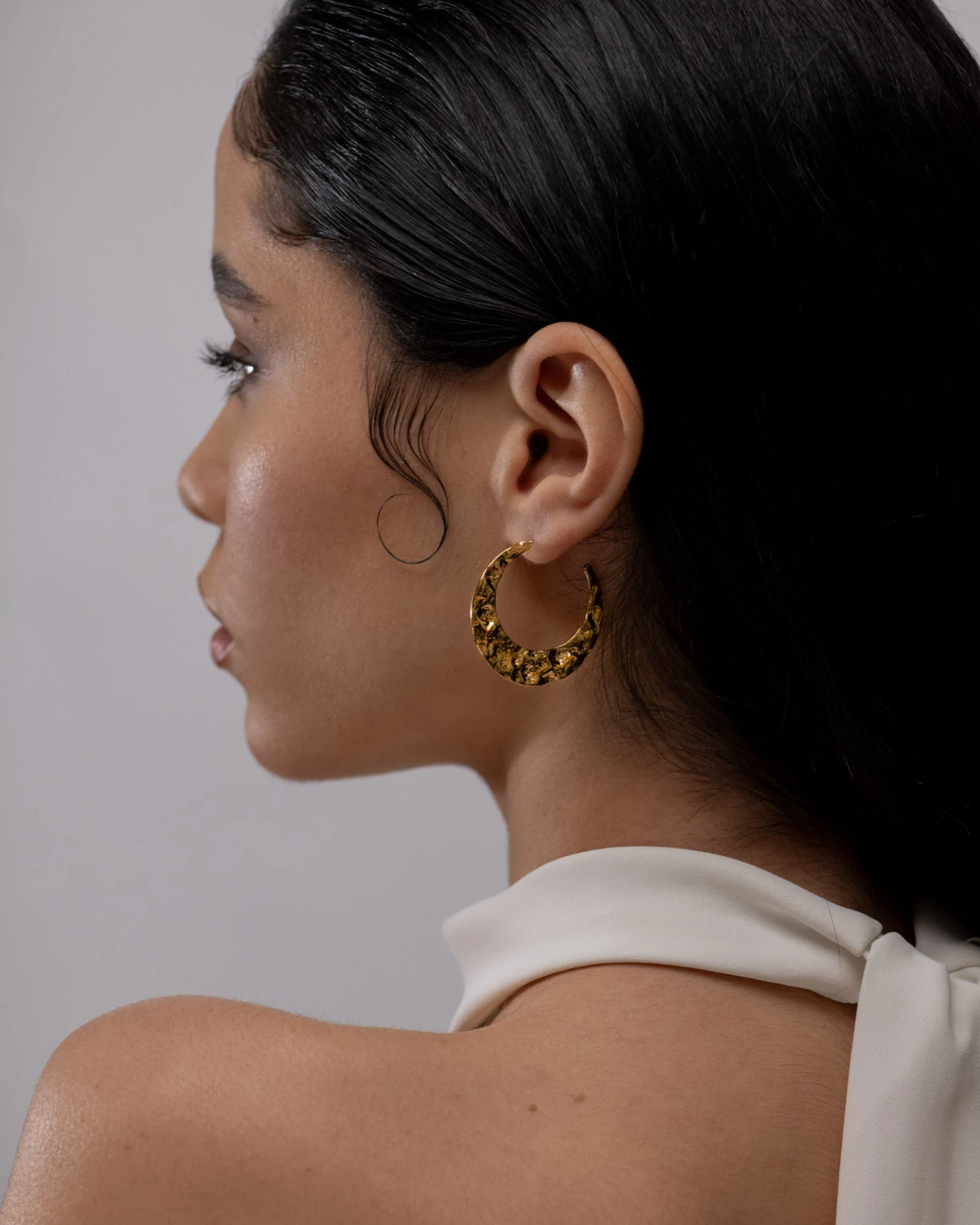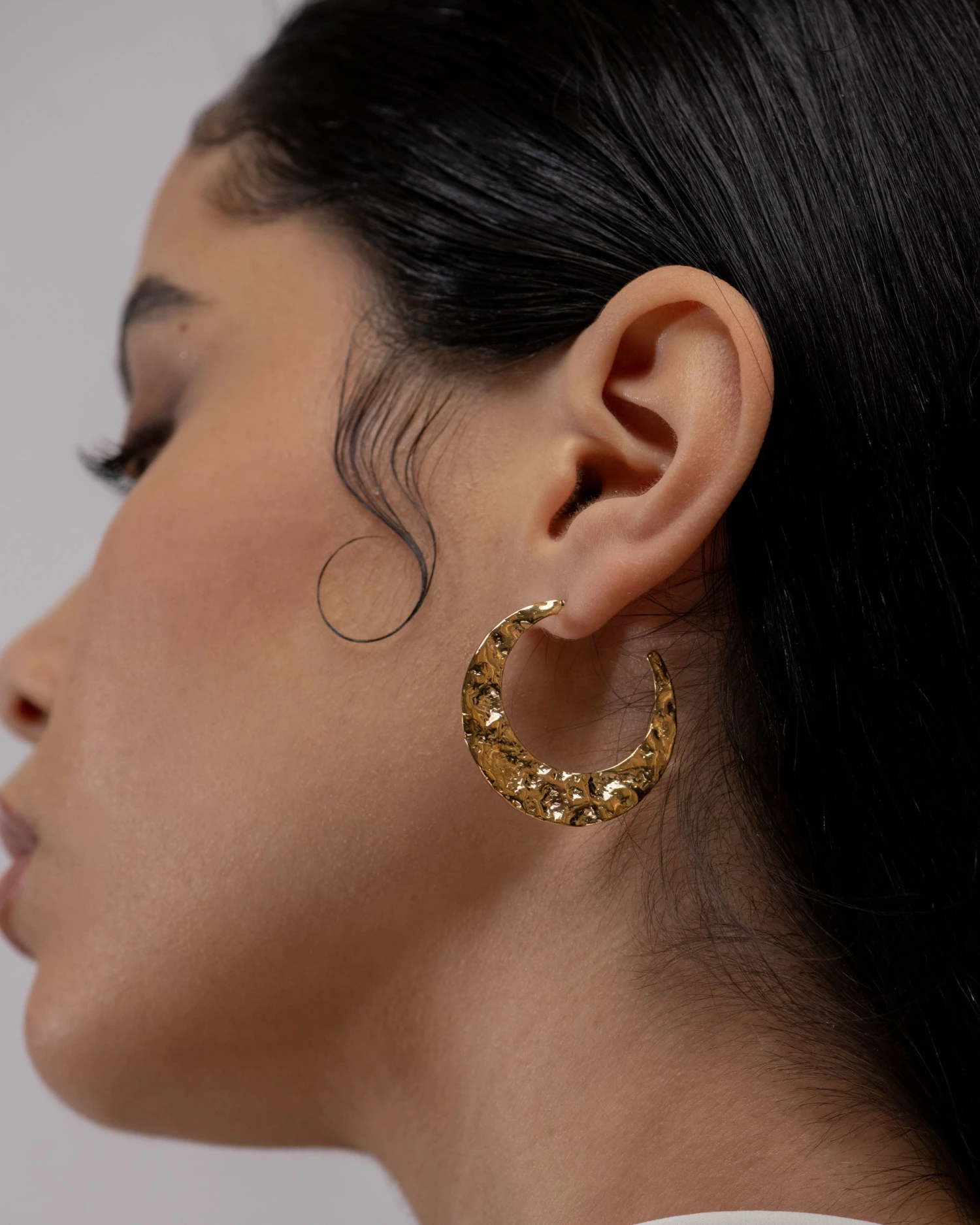 Créoles en forme de lune délicatement martellées et dorées à l’or fin.