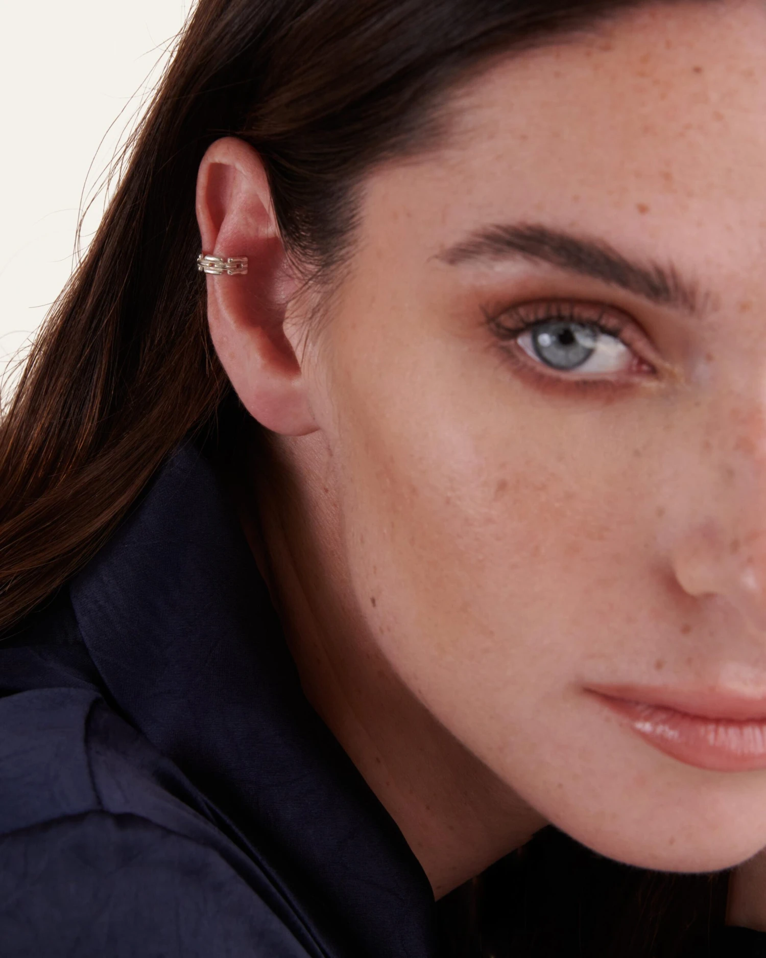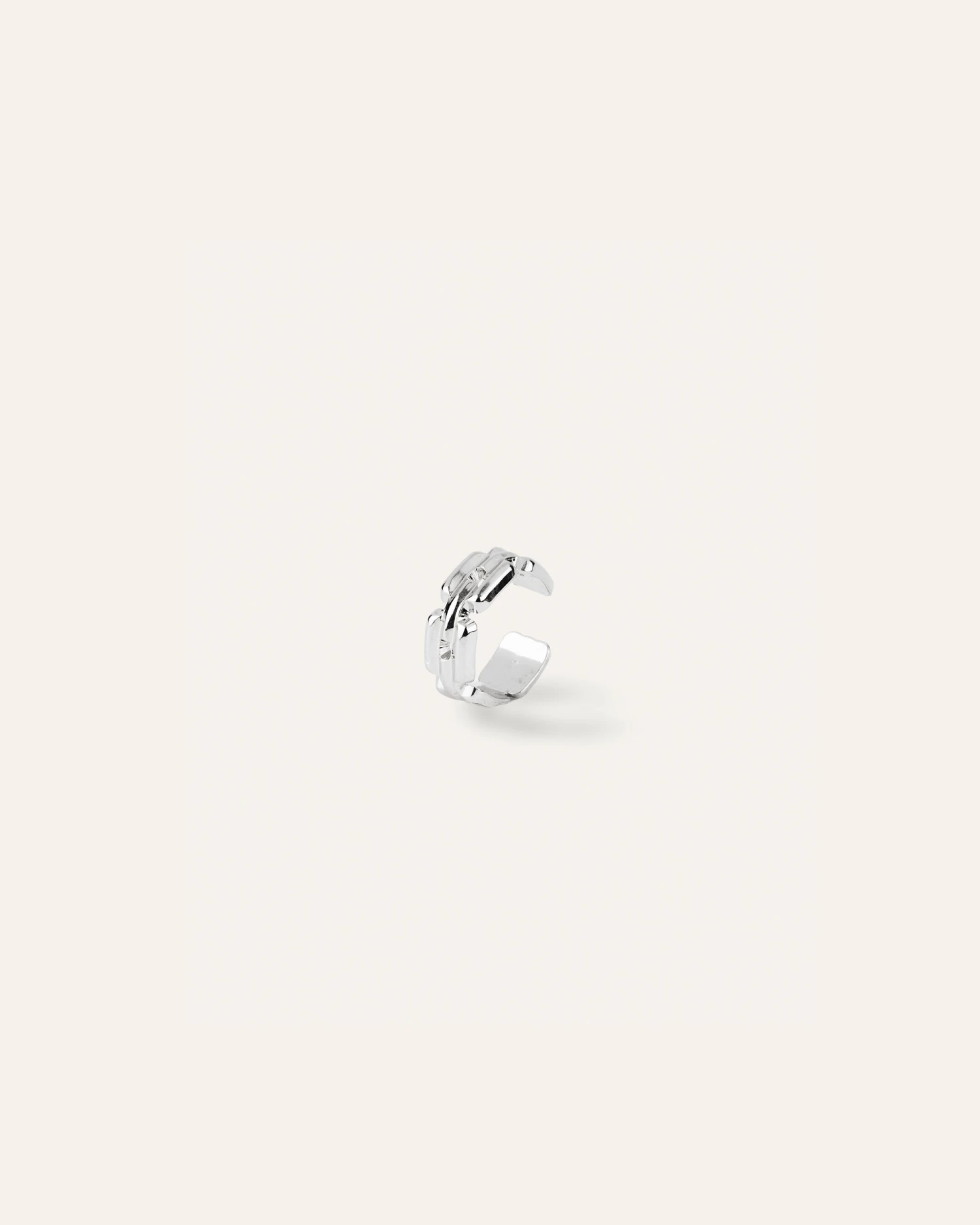 Anneau d’oreille motif chaîne de forme arrondie en argent. Accumulable avec d’autres boucles d’oreilles de nos collections.